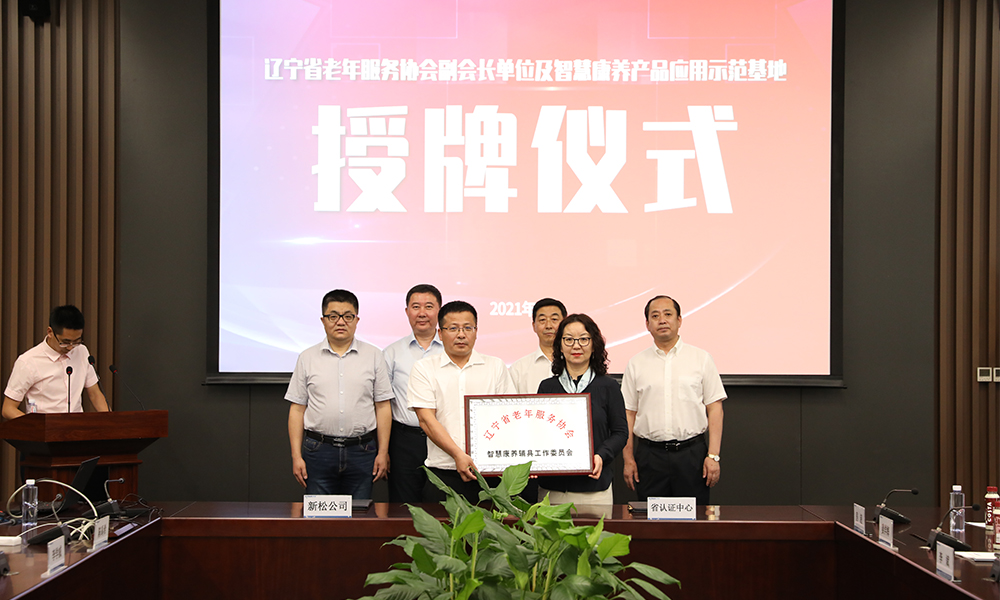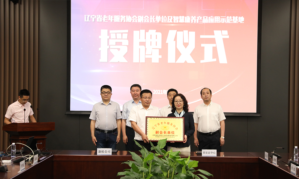 ▲ 辽宁省老年服务协会副会长李笑颖为新松公司授牌
