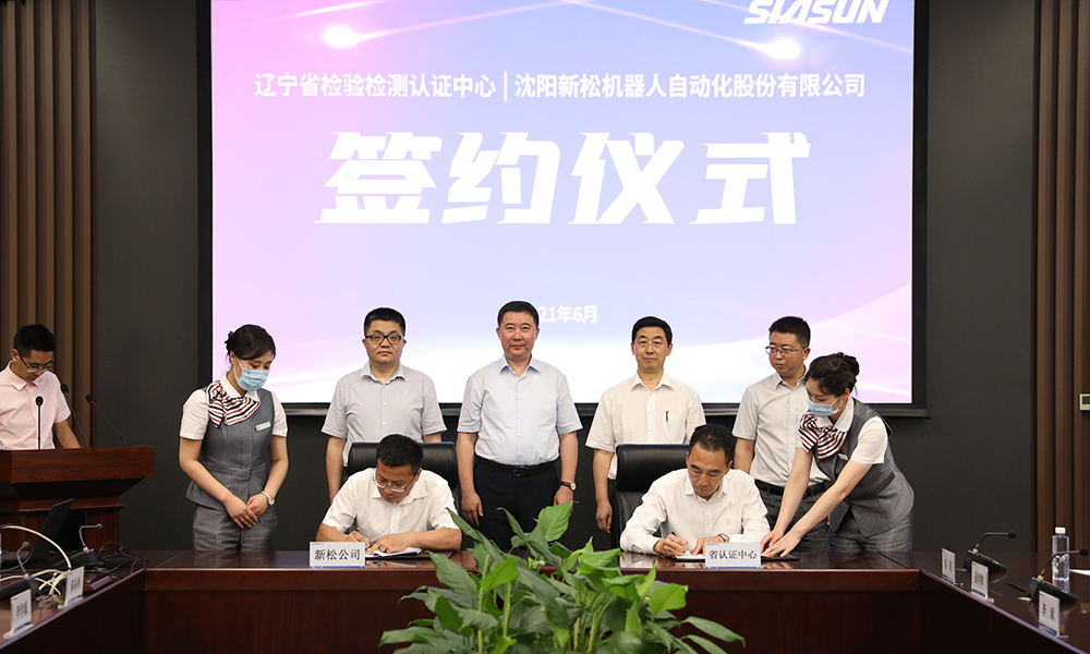 ▲ 辽宁省检验检测认证中心总工程师姜洋海与新松公司李学威总经理代表双方单位签约。