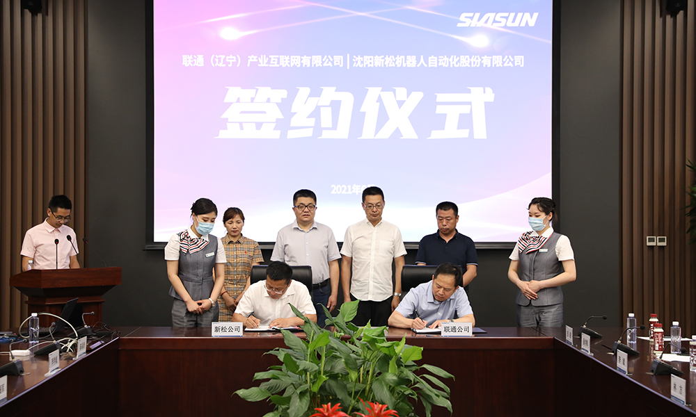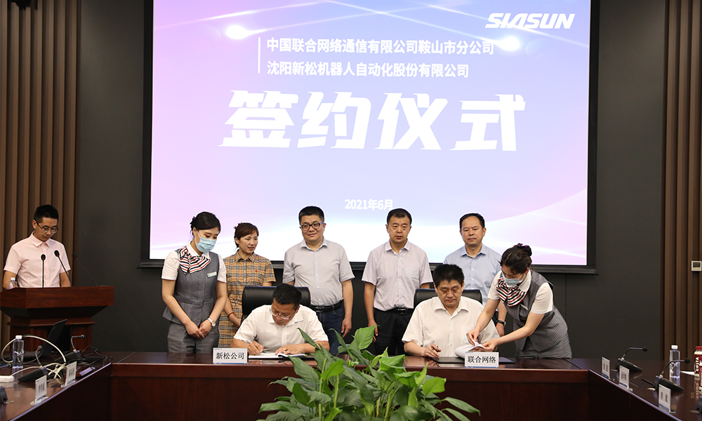 ▲ 中国联合网络通信有限公司鞍山市分公司总经理聂东威与新松公司李学威总经理代表双方单位签约。