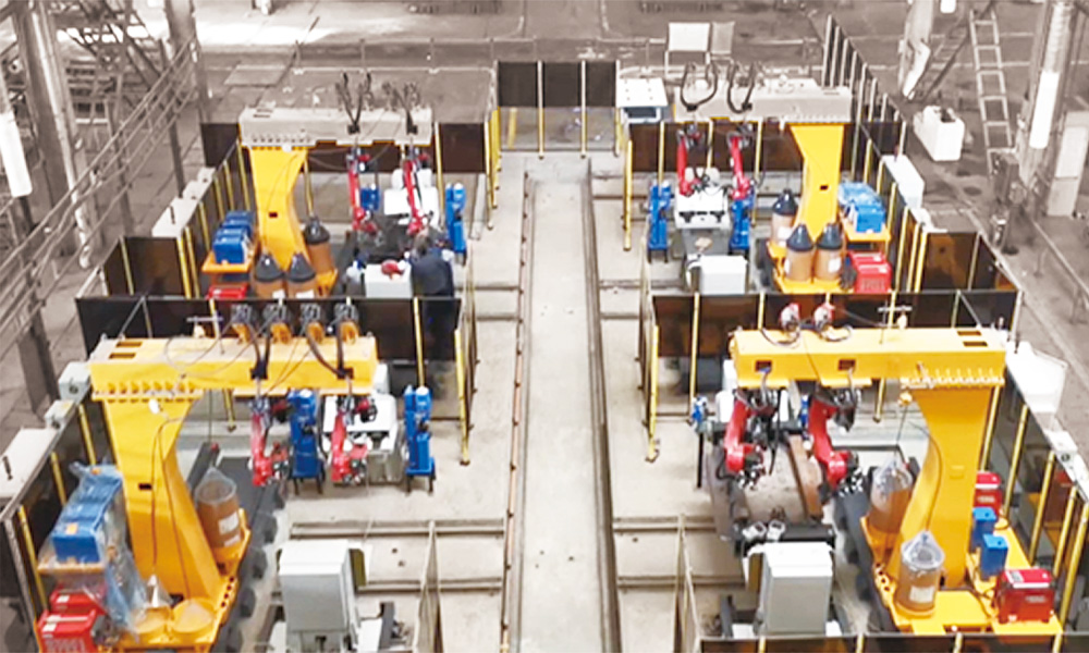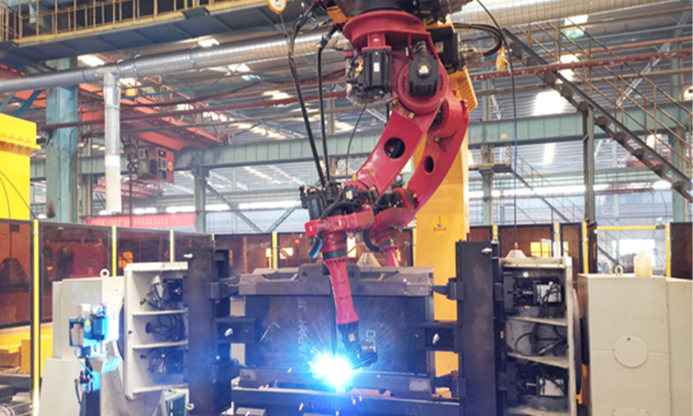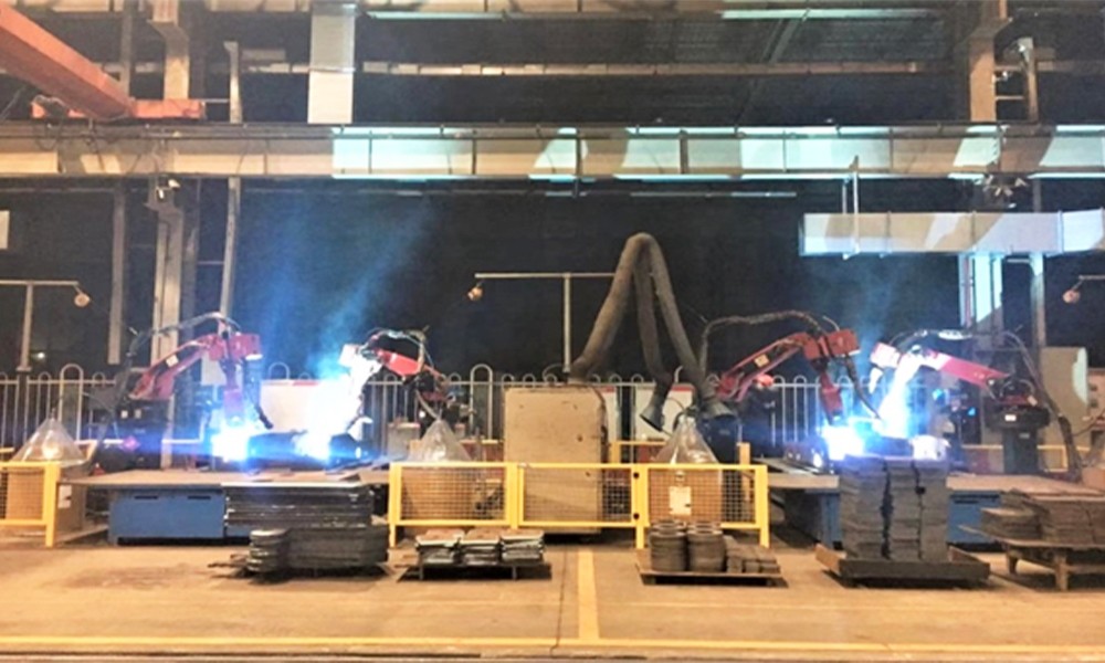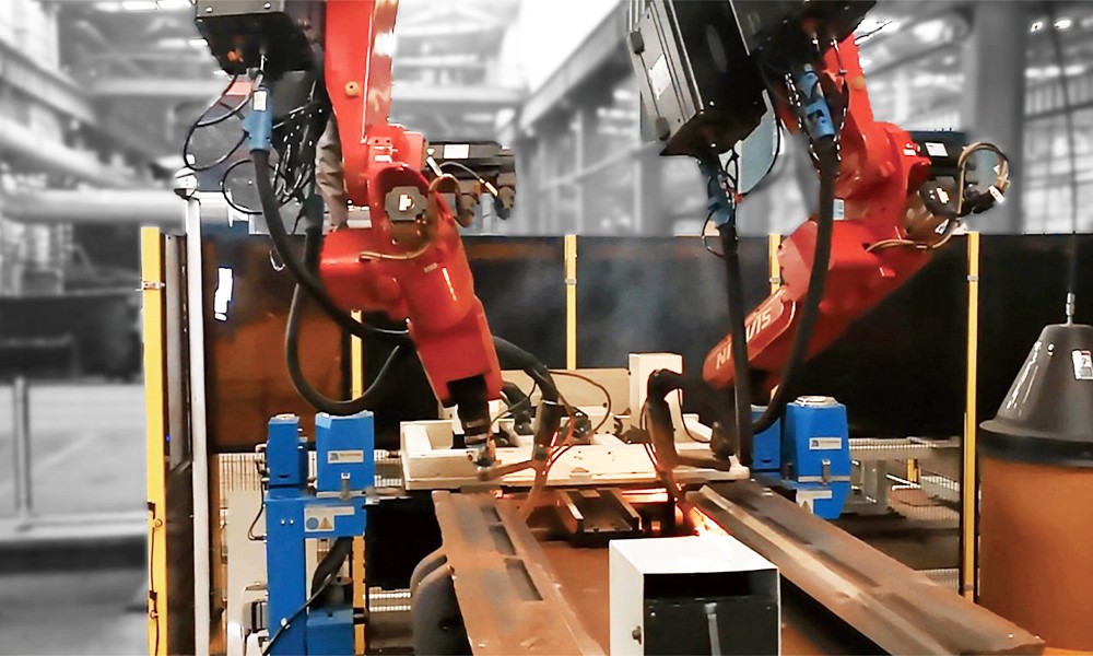新松打造刮板输送机中部槽大型结构件机器人自动焊接生产线,主要包括机器人智能焊接工作站、智能物流输送系统、车间层智能管理与控制系统三部分。