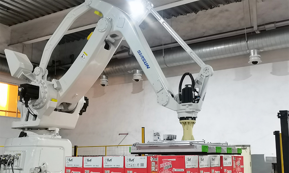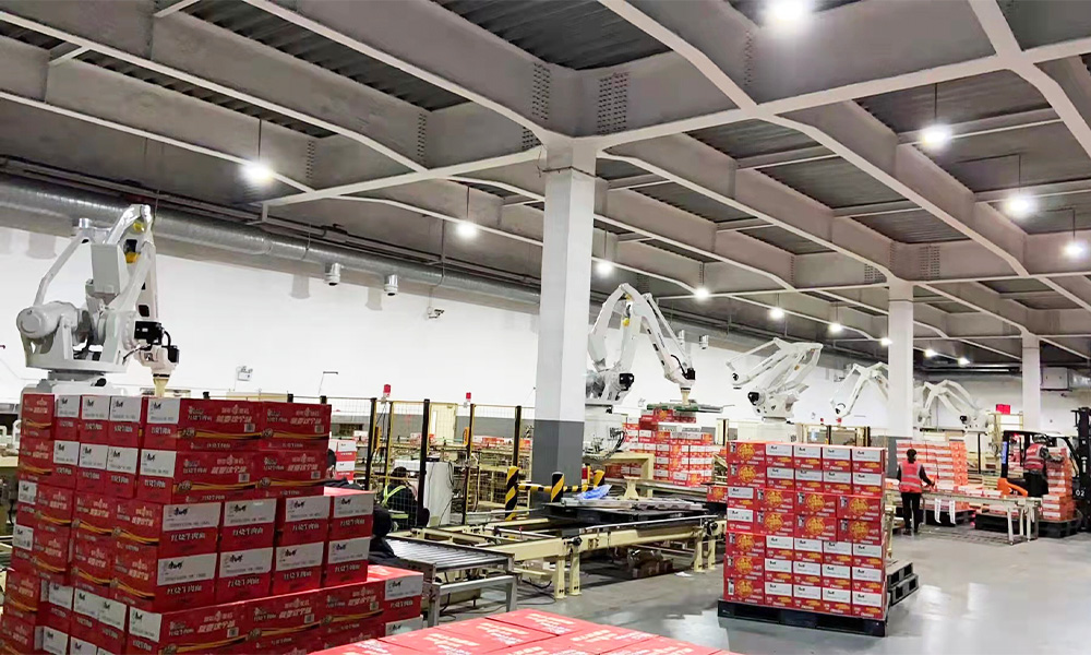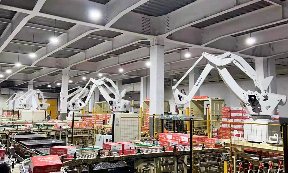 系统主要为成品面箱自动化输送码垛系统。由码垛机器人吸取成品面箱按照预设程序码垛到托盘上。根据产线分布及排产情况,每套机器人对应两条输送线,提高了利用率。