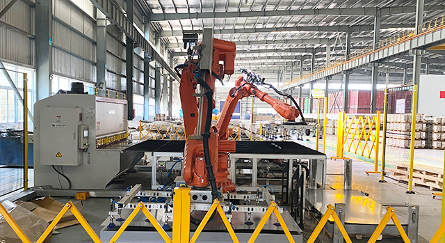 OP40定位完成,机器人送料至剪板机,自动剪切
