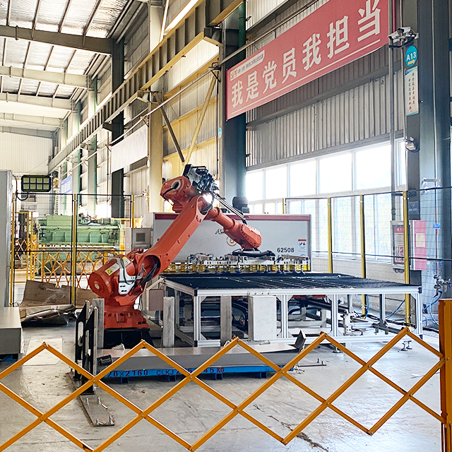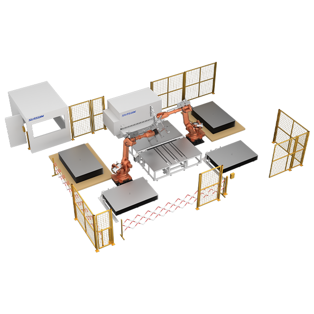 OP40定位完成,机器人送料至剪板机,自动剪切;另一台机器人自动拆垛上料,板料对中