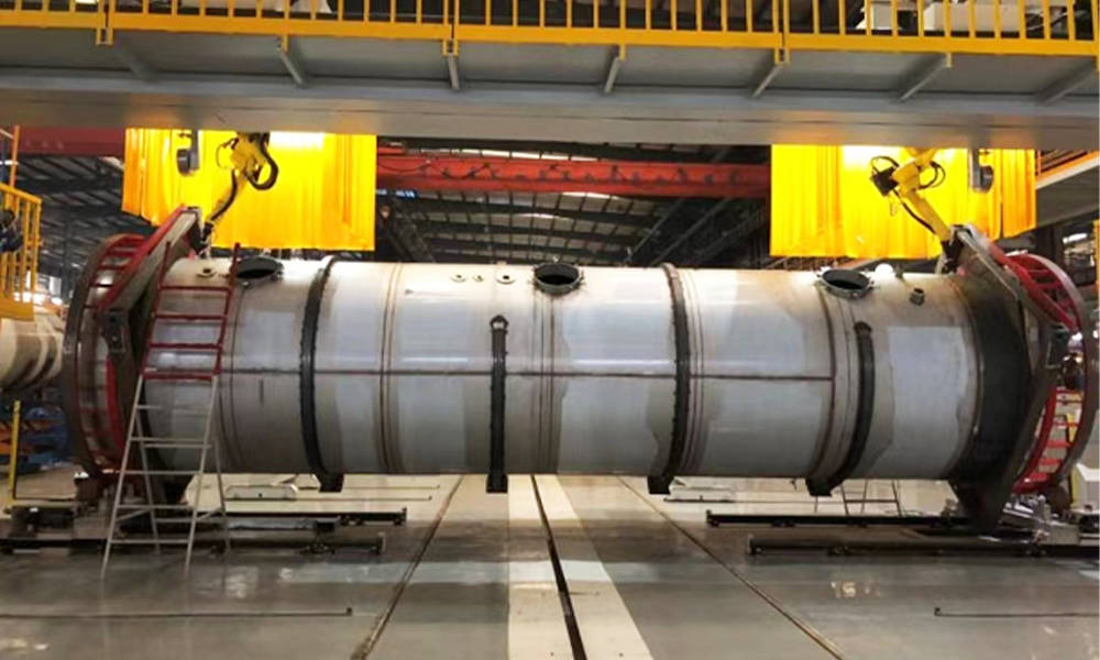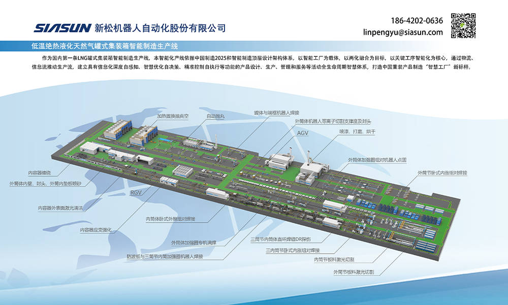 本项目为全球首条LNG罐箱智能产线。新松公司承建产线进行总体规划和实施,涵盖产品工艺流程设计、生产设备规划和产线物流设计、MES产线调度系统等。关键工艺实现自动化、无人化,从源头提升产品质量。