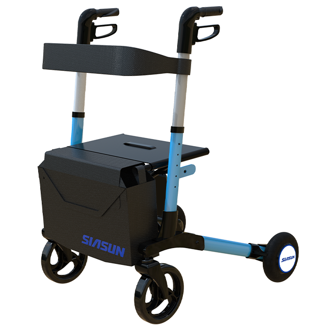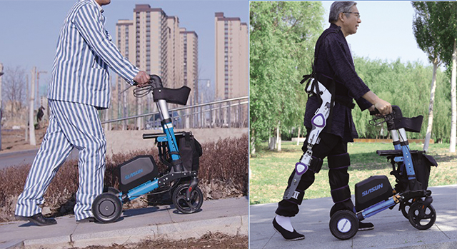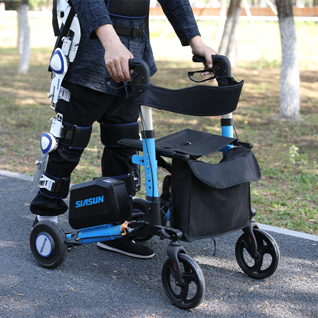 本产品通过新松自研核心算法,使用过程中自动检测行走坡度,根据运动情况实时调节助力阻力模式。本产品已通过CE认证,致力于解决适用人群行走距离短、平衡能力差、容易跌倒等痛点问题。帮助使用者实现自主行走、增加运动机会,让他们走的更远、更安全,改善其身心健康状况,提高生活质量,重获行走自由。产品适用于身体虚弱或患有行走动能障碍的人群,车体设有高度调节,可满足不同身高人群使用。使用本产品时,在上坡和平地时为使用者提供行走助力,下坡时能够保持使用者的速度稳定,防止侧滑的同时保证使用者平衡。产品设计满足使用者日常生活需求,产品前端设有大容量储物空间,同时设有座位,供使用者在外出时临时休息,车身可折叠收纳,节省空间。