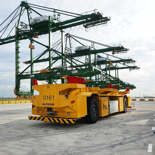 岸桥设备将船上的集装箱抓取后,转运到下方等待的港口机器人上面,由机器人将集装箱运输到堆场区。在作业过程中,由于机器人需要经过多个工作区域,机器人具备自动停障功能,避免发生碰撞。在作业时,机器人会根据系统计算,实现楔形变道,大大的提供了机器人作业的灵活性和通过能力,保证作业效率。在移动机器人进入堆场交互作业区后,负责堆场转运的场桥将集装箱从移动机器人上拿走,实现了整个作业过程。导航方式包括惯导定位、磁钉定位、RTK差分定位、UWB定位、激光轮廓定位、视觉定位、5G定位技术、GPS定位等。同时,产品支持多类型载货需求,可分别单次承载2x20英尺集装箱、2x20英尺罐箱、40英尺集装箱、45英尺集装箱,满足客户的多种需求。产品已远销海外并成功入驻世界著名港口投入使用。